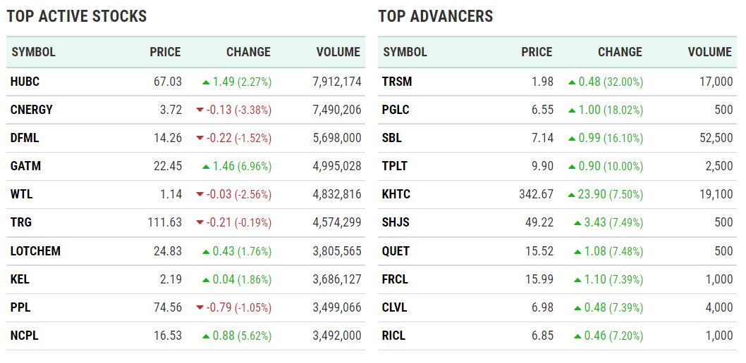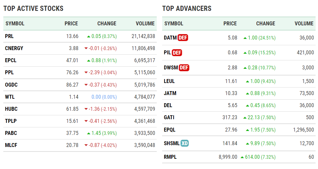 TOP ACTIVE STOCKS SYMBOL PRICE CHANGE VOLUME PRL 13.66 0.05 (0.37%) 21,142,838 CNERGY 3.88 -0.01 (-0.26%) 11,806,498 EPCL 47.01 0.88 (1.91%) 6,695,317 PPL 76.26 -2.39 (-3.04%) 5,115,060 OGDC 86.27 -0.37 (-0.43%) 5,019,786 WTL 1.14 0.00 (0.00%) 4,784,077 HUBC 61.85 -1.36 (-2.15%) 4,597,709 TPLP 15.61 -0.41 (-2.56%) 4,361,468 PABC 37.75 1.45 (3.99%) 3,933,500 MLCF 20.78 -0.87 (-4.02%) 3,590,048 TOP ADVANCERS SYMBOL PRICE CHANGE VOLUME DATMDEF 5.08 […]