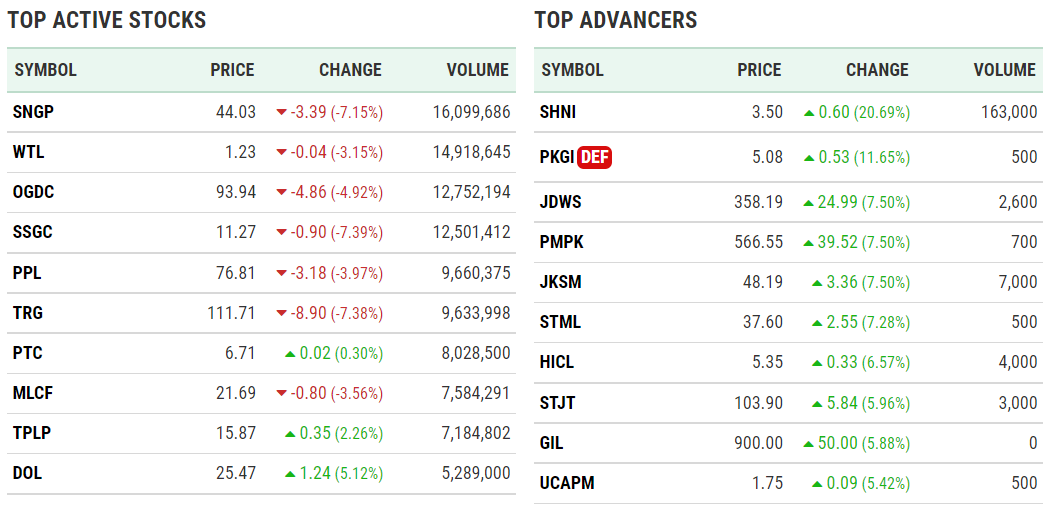 TOP ACTIVE STOCKS SYMBOL PRICE CHANGE VOLUME SNGP 44.03 -3.39 (-7.15%) 16,099,686 WTL 1.23 -0.04 (-3.15%) 14,918,645 OGDC 93.94 -4.86 (-4.92%) 12,752,194 SSGC 11.27 -0.90 (-7.39%) 12,501,412 PPL 76.81 -3.18 (-3.97%) 9,660,375 TRG 111.71 -8.90 (-7.38%) 9,633,998 PTC 6.71 0.02 (0.30%) 8,028,500 MLCF 21.69 -0.80 (-3.56%) 7,584,291 TPLP 15.87 0.35 (2.26%) 7,184,802 DOL 25.47 1.24 (5.12%) 5,289,000 TOP ADVANCERS SYMBOL PRICE CHANGE VOLUME SHNI 3.50 […]