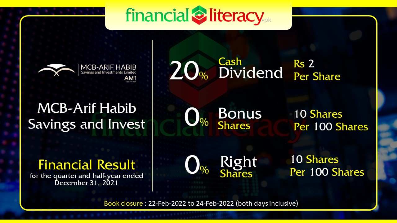 MCB-Arif Habib Savings and Invest. MCBAH Announced 20% Dividend Rs 2 per share 0% Bonus and 0% Rights